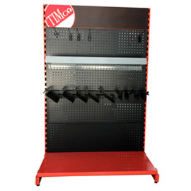 The FT1039 multi-angle hardware tool display rack is the same as the FT1049 corner metal storage stand and the FT1051 double-sided exhibition shelf. They are both high-quality power tool promotion racks customized for the same British customer. They are used for hanging and placing screws, fixings, fasteners, nails, power tool accessroies, builders hardware and other suppliers, etc. The sizes are 120*45*160cm, 150*50*160cm, 300*60*180cm and other light free stand, medium shop shelving and heavy tool station. The whole shelf uses nice black and red metal powder coated and derusting technology. This product is characterized by simple splicing, easy assembly, and flexible placement. It can be seen from the above three racks that there are alone single-sided, double-sided and corners can stand against the wall or be used as island shelves in the stores, and can reuse the space in the corner without losing the beauty. This exhibit holder cooperates with and compensates for other styles of shelves, which is conducive to building and creating an showroom hall, exhibition booth or tool convenience store and hardware supermarket with high space utilization, flexible and simple planning, and diversified layout.